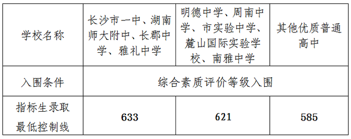 长沙城区普高最低录取控制分数线、综合素质评价控制线和指标生录取最低控制分数线分别意味着什么?划定的指标生最低控制线585分是否就是公办普高的最低线?今天一文说懂这3条中招控制线的作用!城区普通高中最低录取控制分数线市教育局中招办划定2024年城区普通高中(含中职学校对口高考班)的最低录取控制分数为460分。除经审批的特长生外,任何普通高中学校不得录取分数低于普通高中最低录取控制分数线的学生。460分是今年长沙普通高中最低录取控制分数线,除经审批的特长生外,中考总分低于460分,不能被任何普通高中录取。综合素质评价控制线高中学校招生时,报考长沙市一中、湖南师大附中、长郡中学、雅礼中学、明德中学、周南中学、市实验中学、南雅中学、麓山国际实验学校,综合素质评价结果最多允许有一个B等;报考其他省级示范性中学,综合素质评价结果最多允许两个B等;报考其他公办普通高中学校,综合素质评价结果不能含有C等(全部为B或以上)。综合素质评价结果凡有D等的考生,普通高中学校不予录取。指标生录取最低控制分数线585分是今年城区高中指标生录取的第三类优质高中的最低控制分数线,也就是说,填报了第三类优质普高的指标生志愿,如果总分低于585分,就没有入围,更不能被录取。