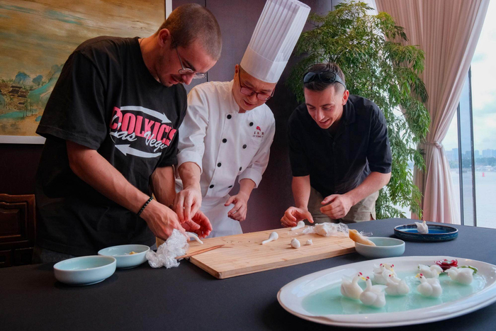 中午时分,两位主演来到白天鹅宾馆,体验 “像生天鹅饺” 的制作课程,在大厨的悉心指导下,亲手制作这道精致的点心。除了 “像生天鹅饺”,主演们还品尝了丰富多样的岭南佳肴,如虾饺、烧麦、叉烧、萝卜糕、艇仔粥、炒牛河等,尽情领略粤菜的独特风味,感受广州饮食文化的博大精深。