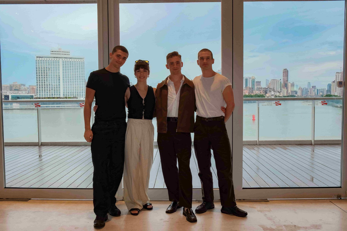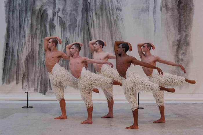 下午,五位群鹅演员前往白鹅潭大湾区艺术中心,在广东美术馆三楼共享大厅上,进行了一辑融合本地特色和演出特色的带妆拍摄,在著名画家徐龙森先生的巨幅山水作品《山不厌高》前,五只来自英国的“男鹅”优雅起舞,翩然生姿。英伦风情与中国山水画的深远意境相映成趣,构成了一幅跨文化的生动画面。