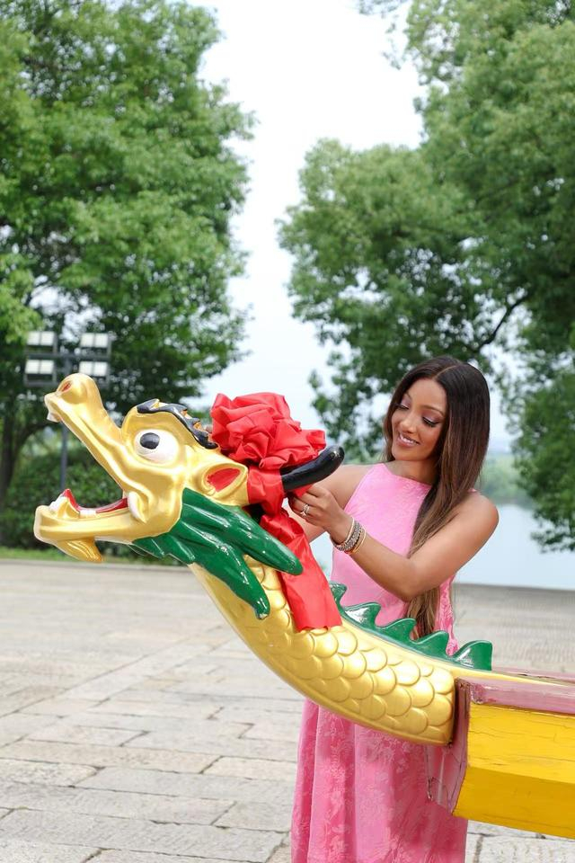 5月31日,美国歌手米奇·盖顿在岳阳屈子文化园景区体验中国端午节划龙舟习俗。(受访者供图) 最初,排位赛的激烈竞争和淘汰赛制都让米奇·盖顿压力巨大,在节目组的帮助下,她开始尝试融入当地文化、融入当地人民——她到怀化感受少数民族风情,被老百姓演唱的苗语版《友谊地久天长》感动落泪;到汨罗游览屈子书院体验端午佳节……