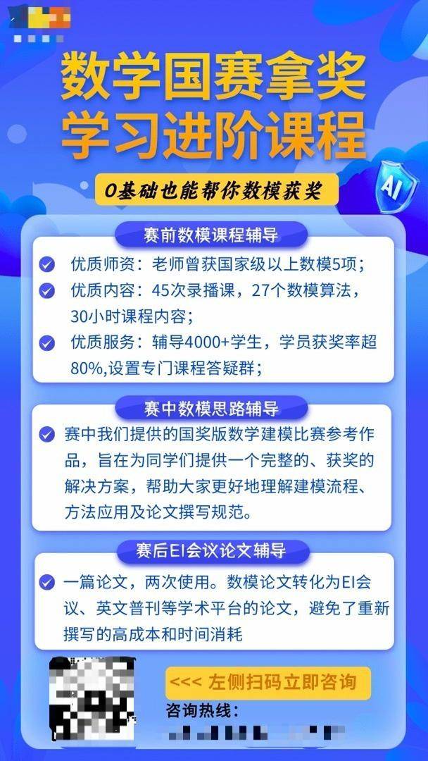 由于效果因人而异,难以预知评测,机构的帮扶更像是一种“玄学”。而在一些消息推送的背后,还可能隐藏着其他生意。“数学建模比赛参与门槛不高,具有高含金量,高性价比,高回报率的优点,对升学、留学、找工作都有很大作用,你值得拥有!”记者在某升学咨询群内看到,老师隔三岔五就会推荐一项数学比赛,号称“九月开赛,六七月准备完全来得及,0基础也能帮你数模获奖”。