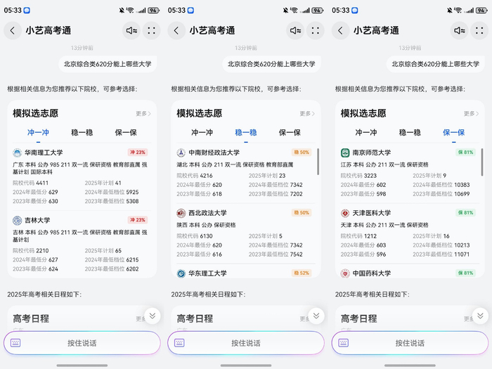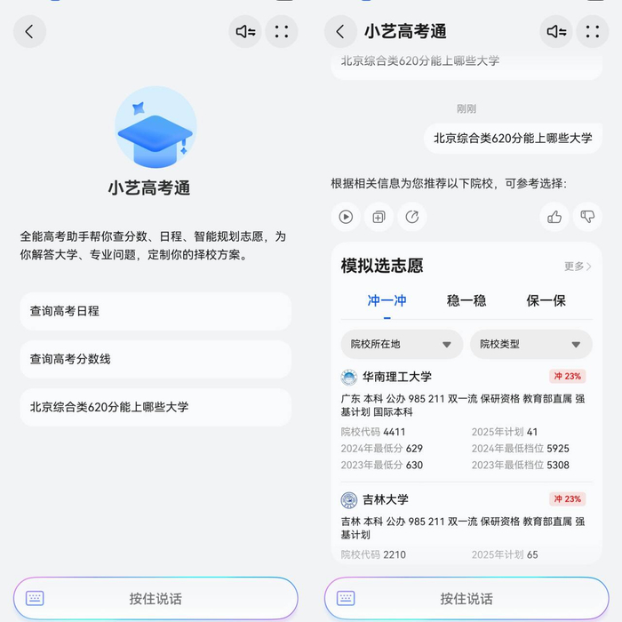 依托于昇腾云算力底座,全新的鸿蒙系统级智能体小艺融合了盘古大模型与DeepSeek双模型能力,基于全新小艺推出的小艺高考Agent能听懂并理解用户复杂意图,让用户更快速便捷掌握高考相关的服务和资讯。因此,当高考成绩公布后,考生或家长想要查询院校、分数线、志愿规划建议、模拟选志愿及相关专业等信息时,找到小艺高考Agent问一问就可以快速获得最新的高考资讯信息。比如在高考分数线公布后,打开小艺高考Agent问小艺:“北京综合类620分能上哪些大学”,小艺就会结合已有信息进行分析和整理,高效给出专业的答复。