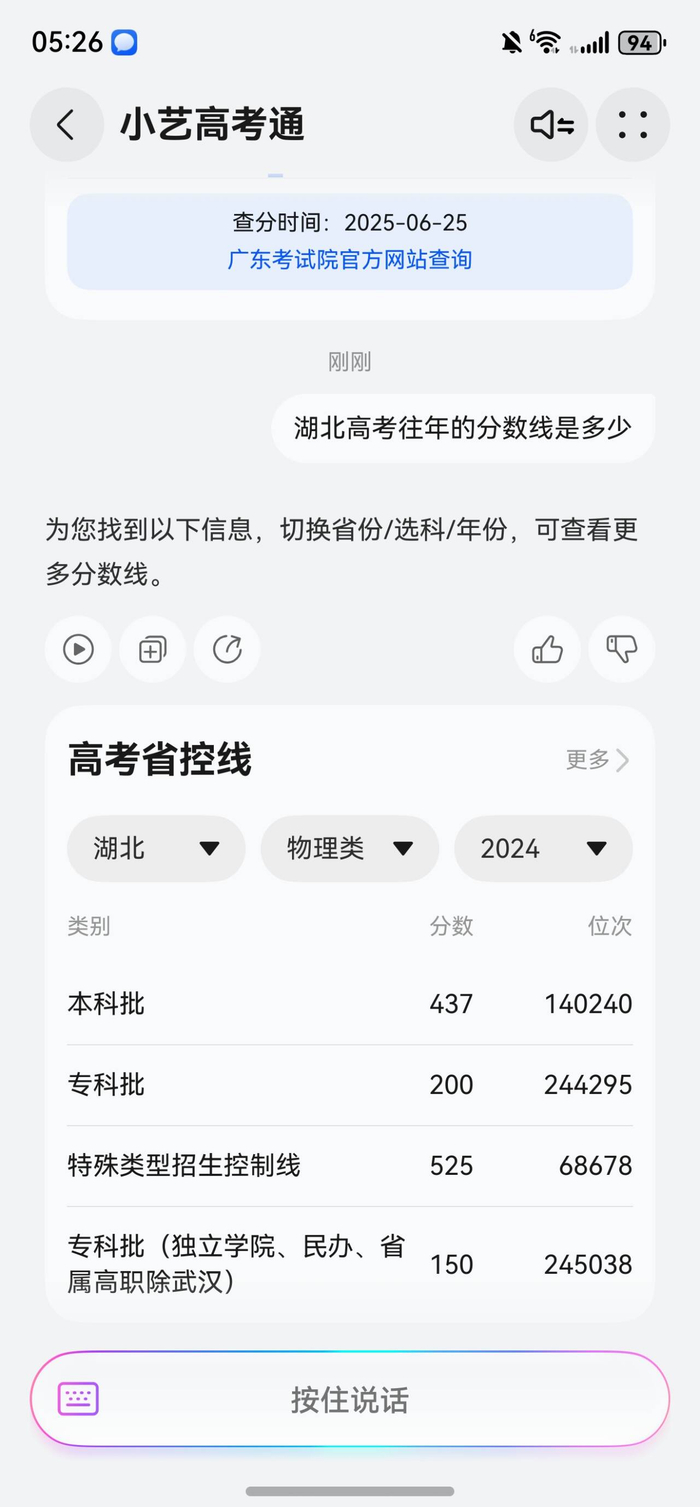 与此同时,小艺高考Agent深度整合了中国教育在线 · 掌上高考的权威信息,能够为用户提供精准的分数查询服务,包括精准获取各省的省控线、分数线及位次、以及本科与专科批次的分数线趋势等关键信息。只要打开小艺高考Agent后,点击“高考分数线”,即可获得以表格形式呈现的高考省控线信息表,切换表格上的省份、科目和年份等变量,就可以按照用户需要精准地查询到具体省份对应科类在不同年份不同录取批次的录取分数线及排位,让考生可以一目了然地掌握关键的录取信息,跨越信息鸿沟,为做好志愿规划打好基础,不浪费“考”到的每一分。