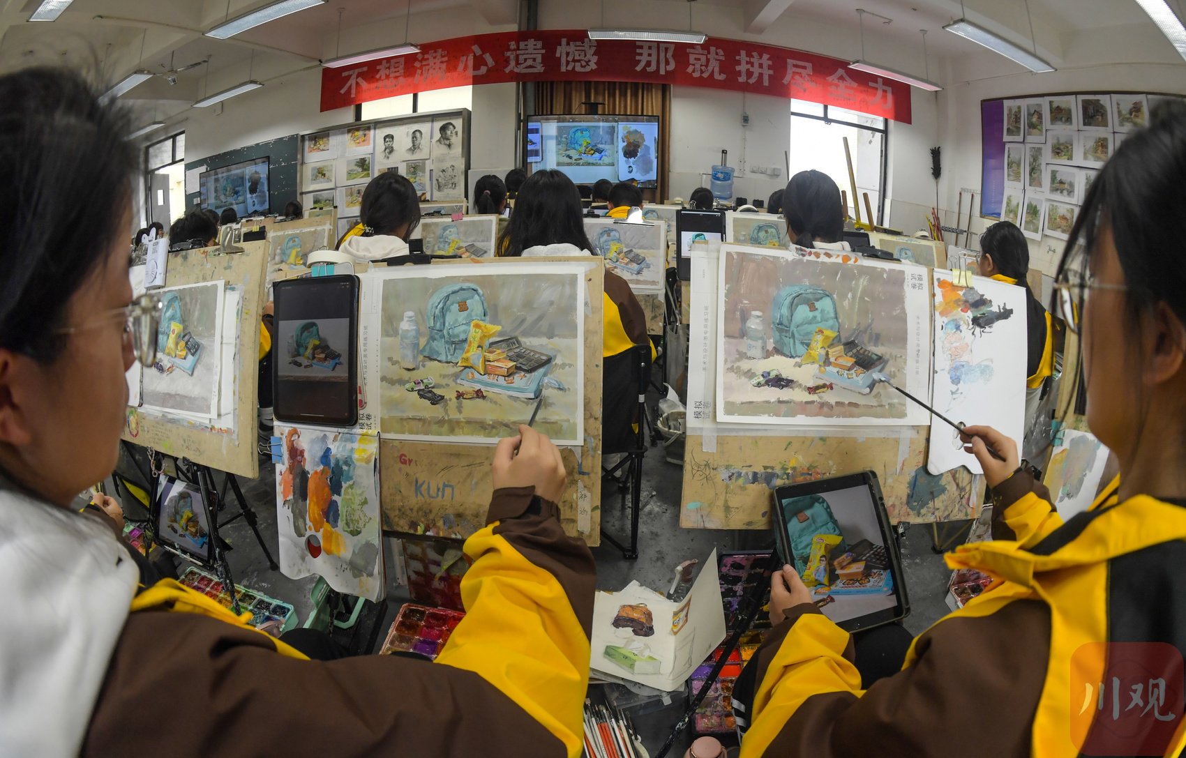 在四川省成都艺体中学美术教室,美术生正在练习绘画。