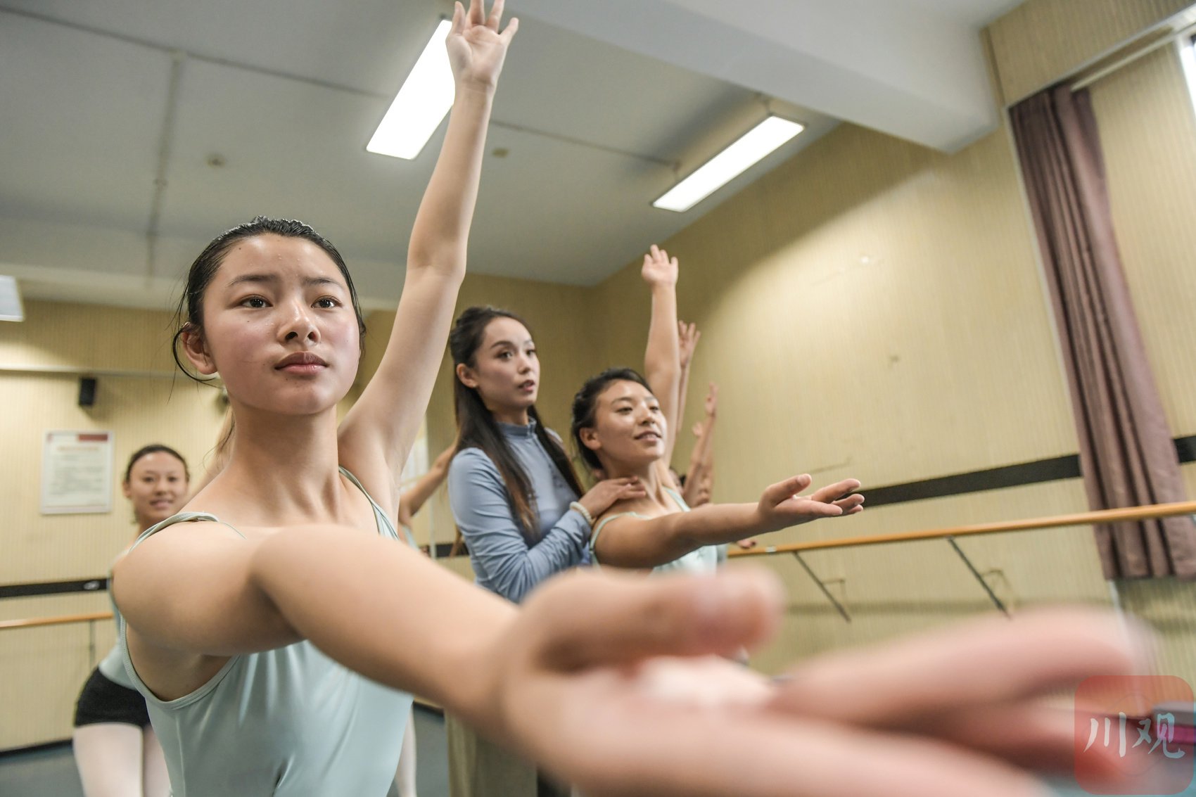 在四川省成都艺体中学舞蹈教室,舞蹈专业学生在老师的指导下学习舞蹈动作。