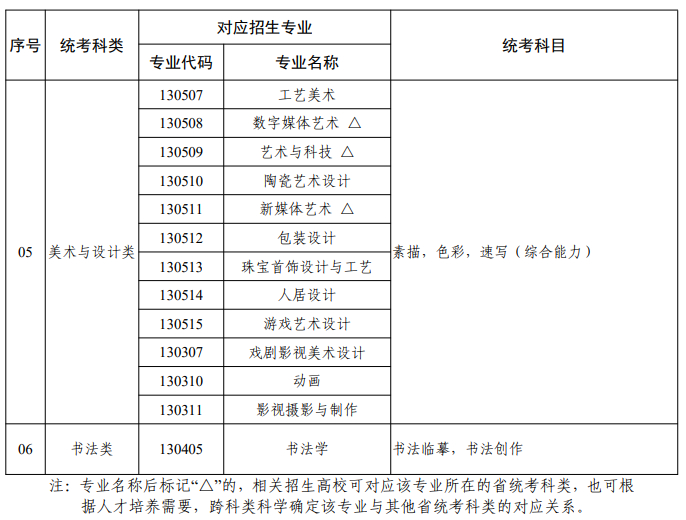 省统考分为音乐类、舞蹈类、表(导)演类、播音与主持类、美术与设计类和书法类6个科类,艺术类考生只能选择其中一种,不得兼报。其中,报考音乐类的考生可以兼报音乐表演(声乐)方向、音乐表演(器乐)方向和音乐教育方向;报考表(导)演类的考生,可以兼报戏剧影视表演方向、服装表演方向和戏剧影视导演方向;报考播音与主持类的考生,可以兼报普通话方向和粤语方向。戏曲类专业实行省际联考,拟报考戏曲类专业考生须先高考报名选择戏曲类,相关具体报考和招生录取办法另文通知。广东艺术类专业省统考及戏曲类专业省际联考已基本涵盖所有艺术类专业,艺术类考生均应报名参加艺术类专业省统考或戏曲类专业省际联考。