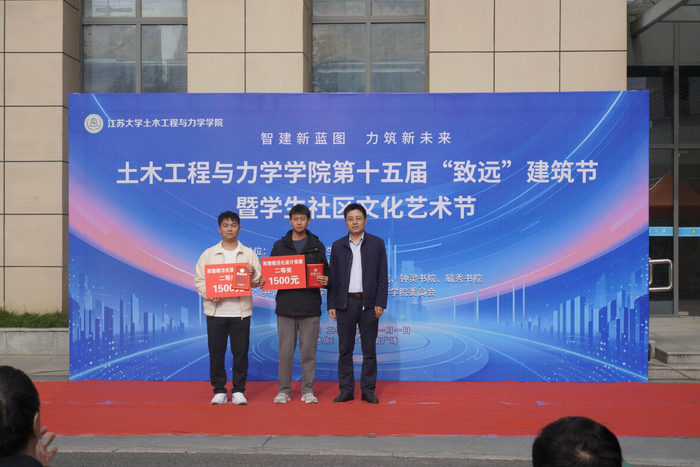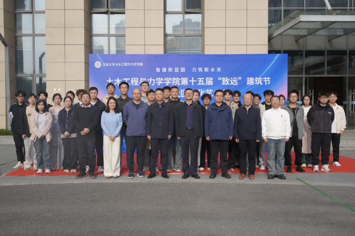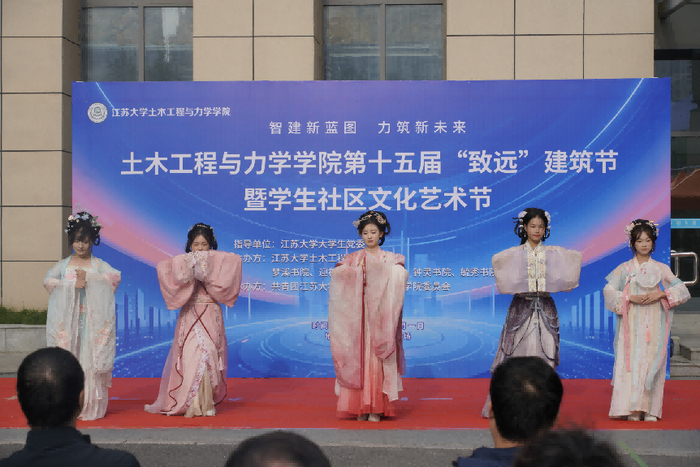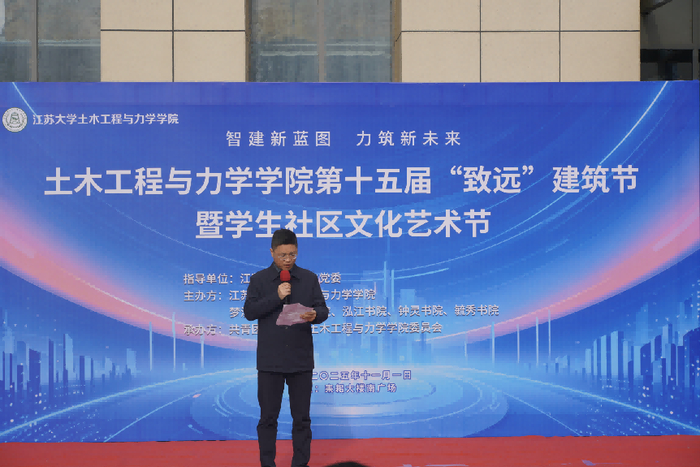 交汇点讯 11月1日,江苏大学土力学院第十五届“致远”建筑节暨学生社区文化艺术节在该校耒耜大楼南广场开幕。本届建筑节以“智建新蓝图 力筑新未来”为主题,融学术竞赛、艺术展演、科技体验与社区文化于一体,为广大师生呈现了一场精彩纷呈的校园文化盛宴。江苏大学钟灵书院党总支书记付刚、土力学院副院长陆春华、土力学院党委副书记副院长倪荣臻、智建系主任张富宾、土力学院实验中学副主任延永东等出席开幕式。