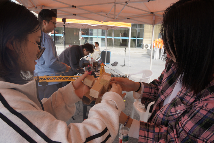 广场上的各类子活动区域人头攒动,气氛热烈。在模型展示与加载区,精巧的结构模型承受着一次次挑战,引来阵阵惊叹。BIM设计展示区和智能建造体验区则让同学们亲身感受到数字技术与VR科技为建筑业带来的革命性变化。此外,“榫卯·承重·平衡工坊”“数字华容道”“步步高升合力建塔”“术语知‘筑’”等十余个互动游戏,将复杂的土木工程知识转化为趣味盎然的挑战,同学们在玩乐中加深了对专业的理解。活动现场还设置了集章抽奖环节,参与者通过体验不同项目收集印章,即可赢取小米手环、定制冰箱贴、精美钥匙扣等丰厚奖品,极大地调动了大家的参与热情。