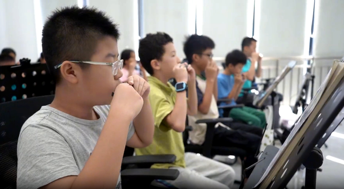 另一边的口琴班,老师正用钢琴领奏,学员们一同用口琴合奏,两种乐器的声音交织在一起,让人陶醉。“我是第一次学习吹口琴,这里的氛围很好,大家上课都很活跃。”“我准备上初中了,想着学一门乐器提升自己的文化修养。”“老师很棒,课程也很有意思。”休息时间,口琴班的小学员们聊起上课的趣事,满脸笑容。