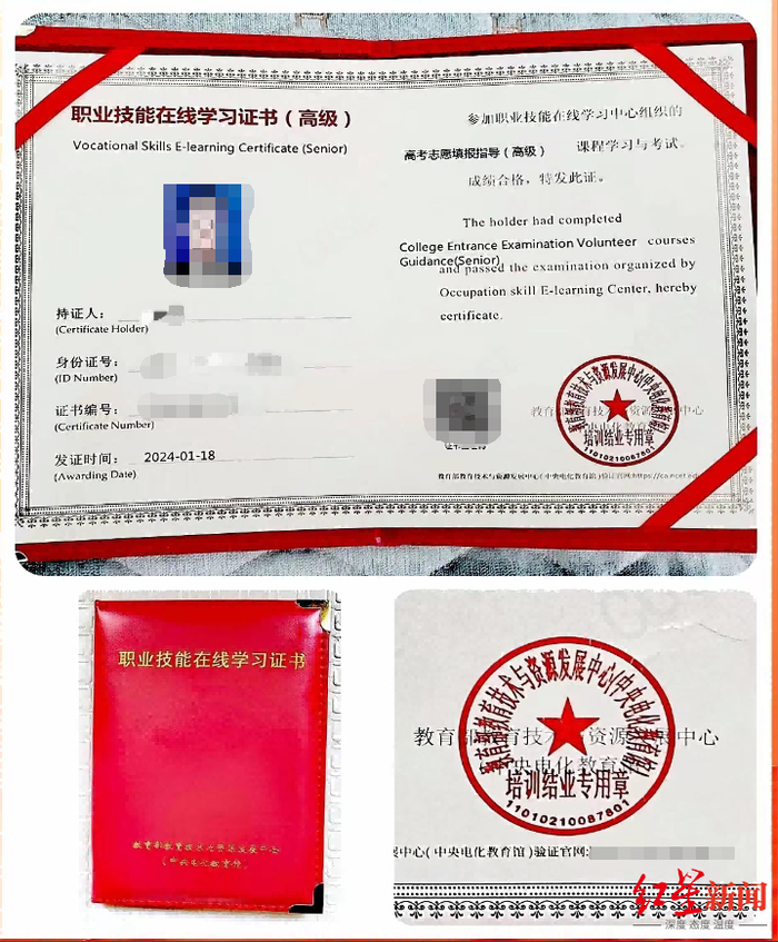 一家培训机构告诉红星新闻记者,“0基础、0门槛,从0起步学习掌握高考报考”,只需要21课时,每课1.5小时,“21天成为高考规划师”,获得教育部官方颁发的证书,其提供证书盖章为教育部教育技术与资源发展中心培训结业专用章。其培训费用原价3680元,限时优惠价格只要1680元。“培训后可以入驻平台,免费使用高考报考大数据,平台推荐客户。”